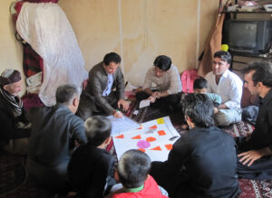 Participatory Social Mapping and Wealth Ranking: Community members created this map to visually assess and categorize households based on local criteria. The different symbols on the houses represent household wealth, categorized specifically by the number of livestock owned, ensuring a community-defined profile of well-being.