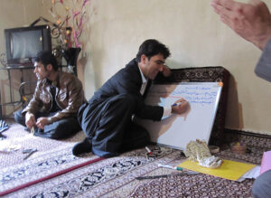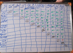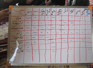 Participatory Well-being Ranking: Community members are using beans to collaboratively score and rank households (listed by name in the rows) against specific criteria. This exercise enables a transparent, community-led analysis of relative wealth and vulnerability.