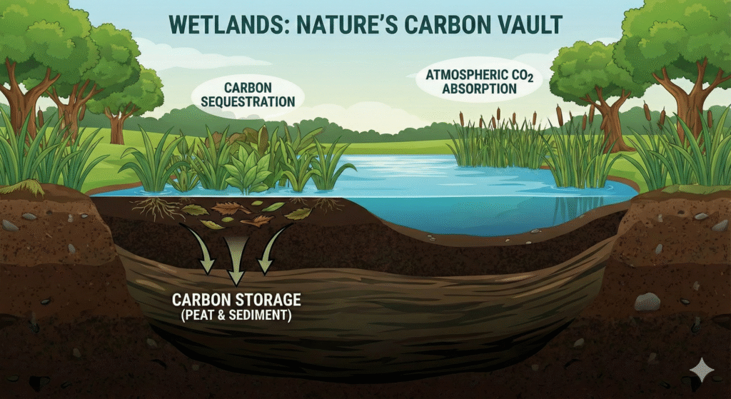 Peatlands cover only about 3% of the world’s land surface, yet they store twice as much carbon as all the world’s forests combined. Because wetlands are waterlogged, organic matter doesn’t decay and release carbon dioxide the way it does on dry land. Instead, it accumulates over millennia. When we drain wetlands for agriculture or development, we aren’t just stopping a sink. We are unlocking a vault and releasing thousands of years of stored carbon back into the atmosphere in a matter of decades.
